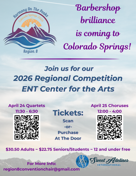 Barbershop brilliance is coming to Colorado Springs. The ultimate barbershop contest of 23 quartets and 12 choruses is being held on April 24 and 25th, 2026 (respectively.) Special appearances by the 2024 International Queens of Harmony, Clever Girl quartet!