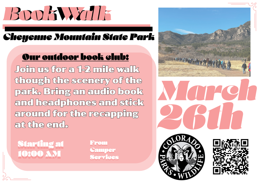 Take in the views of nature at Cheyenne Mountain State Park while enjoying your audiobook, with headphones. Join a park naturalist on this easy 1 - 2 mile walk through the park. At the end, we will sit and share what we read/listened to.