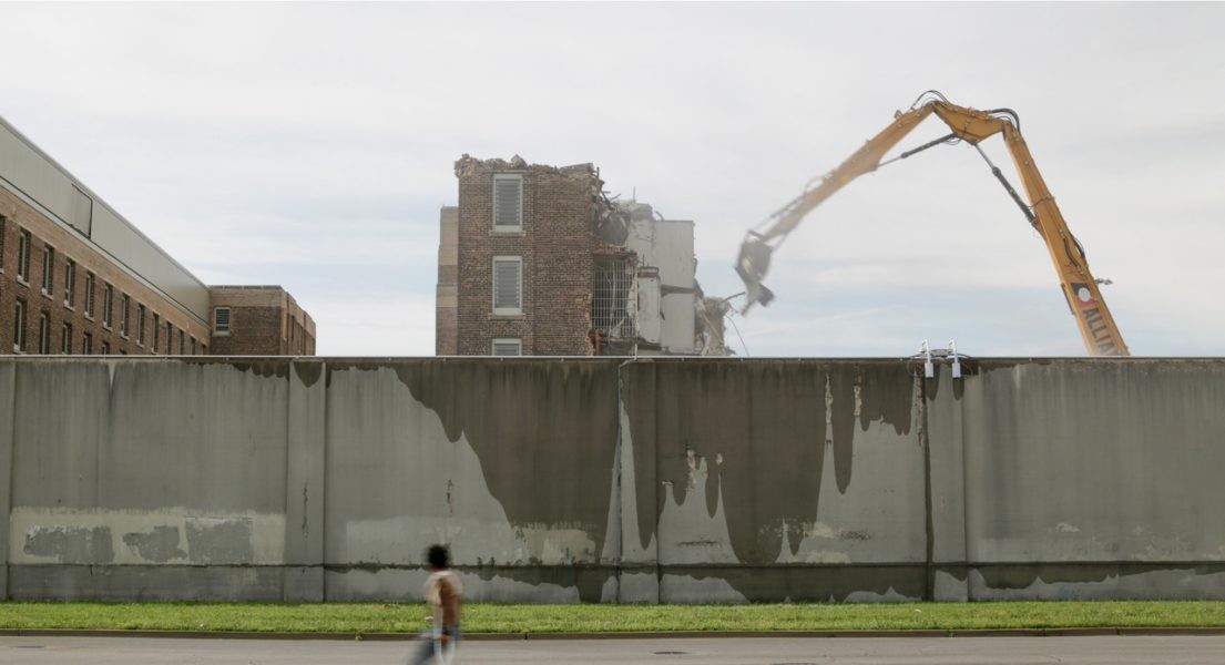 In summer of 2021, the Cook County Department of Corrections began the demolition of two jail dormitories. The buildings, perhaps best known for housing the likes of Al Capone, were more than a hundred years old. The artist Maria Gaspar, who grew up in Little Village, the same neighborhood where the jail is located, documented the demolition and site restoration over the course of two years. She positioned her camera across the street from the project, fixing its view on the long concrete wall that marks the border between the jail and the residential neighborhood. The result is Clamour, which is sixty hours and twenty minutes in duration and captures one section of the building block being torn down, from start to finish.