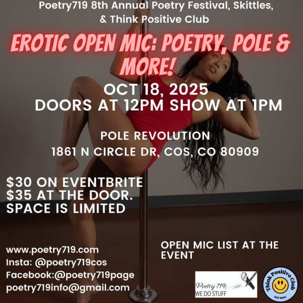 Join Poetry719 , Think Positive Club and Professional Pole Athlete Skittles for the Erotic Open Mic.