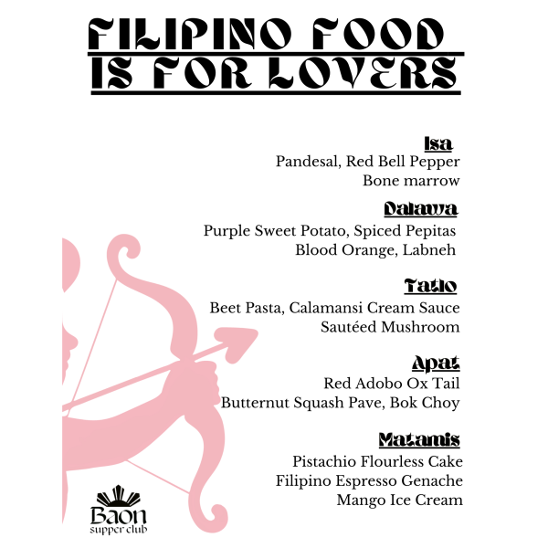 Celebrate Valentine’s Day with Filipino Food is For Lovers, a communal five-course Filipino-inspired dinner hosted by Baon Supper Club. The evening features a welcome cocktail (zero-proof available), five thoughtfully curated courses highlighting Filipino flavors, take-home “baon” goodies, and an optional cocktail pairing — all served with warm hospitality and a focus on culinary storytelling.