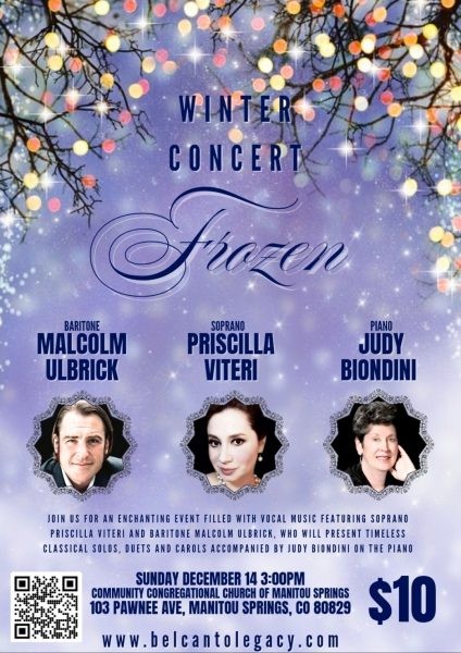 Our winter concert will feature soprano Priscilla Viteri and baritone Malcolm Ulbrick who will perform opera scenes, duets and holiday classics accompanied by Judy Biondini on the piano.