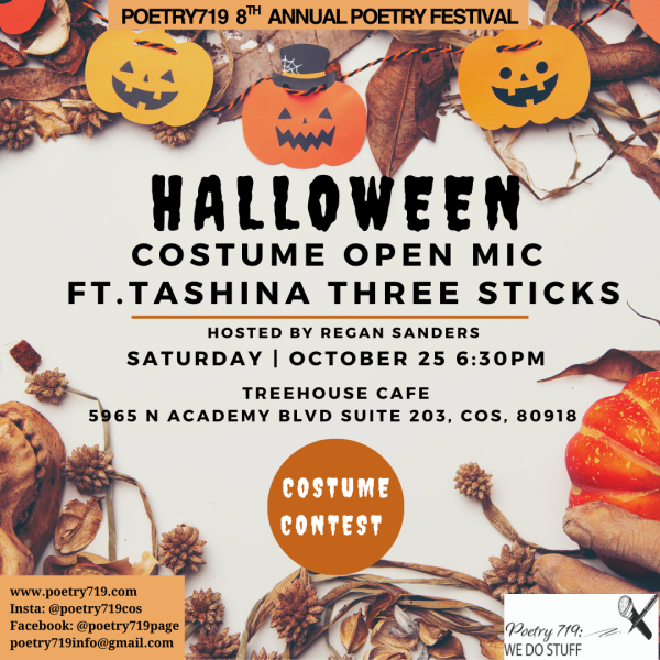 Bring your best costumes and poetry to the mic for our Halloween costume open mic! We'll have a workshop, all acts open mic, and a costume contest. With a special feature from Tashina Three Sticks! Hosted by Regan Sanders! Can't wait to see your costumes and hear your words!