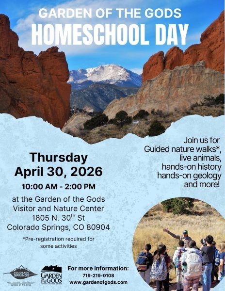 Join us at the Garden of the Gods for our Homeschool Day event! Hosted at the Garden of the Gods Visitor & Nature Center, this special event is designed with homeschool families in mind. It offers personalized nature walks, hands-on geology and history activities, and live animals! Explore towering red rock formations, discover fascinating wildlife, and connect with other homeschool families in a fun, engaging environment.