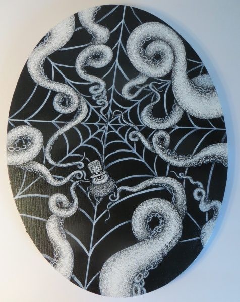 I enjoy working with and mixing up a vast array of different mediums and techniques including loose watercolor style paintings, super tight and tiny pointillism pen and ink drawings, large interlocking collages, custom toys and mixed medium shadow boxes.