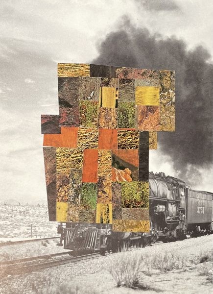 So, these collages are meditations on our history and our hubris. I’m referencing the westward expansion of the American empire by using vintage train imagery. And I’m obscuring and superseding those images with fragmented patchworks of grass, dirt, foliage and flowers. I’m asking if, in the elevation of nature, it’s possible to shift our focus off “what we own,” toward “what we owe?”