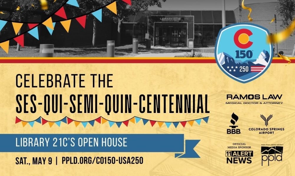 Join us at Library 21c as we celebrate the ses-qui-semi-quin-centennial of Colorado and the United States. Enjoy a round of Pikes Peak Bingo, be a part of history as we add you into historical photos (or the new 150/250 Library card), and share your memories of PPLD in the studio.