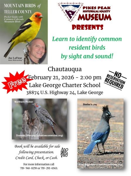 Pikes Peak Historical Society invites everyone to come to Lake George Charter School for a presentation on birds and bird watching throughout the Colorado Mountains.