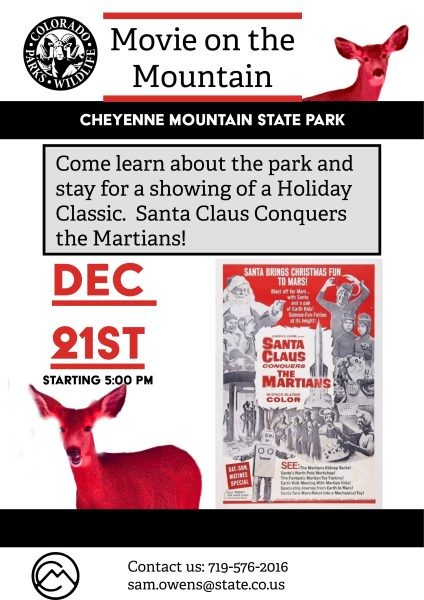 Join us the Sunday before Christmas for a special event. Cheyenne Mountain State Park we will be hosting our Movie on the Mountain. Come learn more about our park and Colorado public lands, and stay for the showing of a free movie!