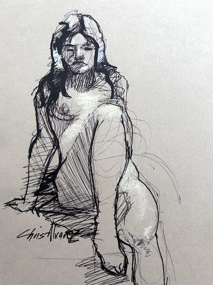 Chris Alvarez is know for his bold and colorful paintings. He regularly meets with a group to draw and spent the last few months at music festivals drawing musicians. Chris is a master of drawing as well as painting.