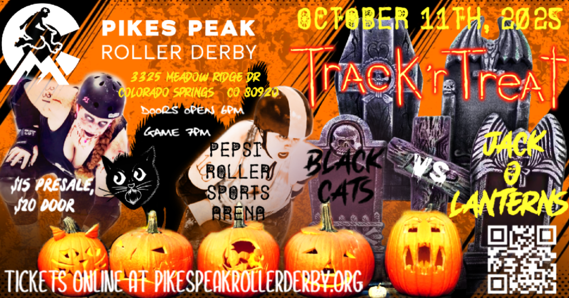 Pikes Peak Roller Derby presents Track 'r Treat – a Halloween-themed roller derby battle between the Black Cats and the Jack O' Lanterns!