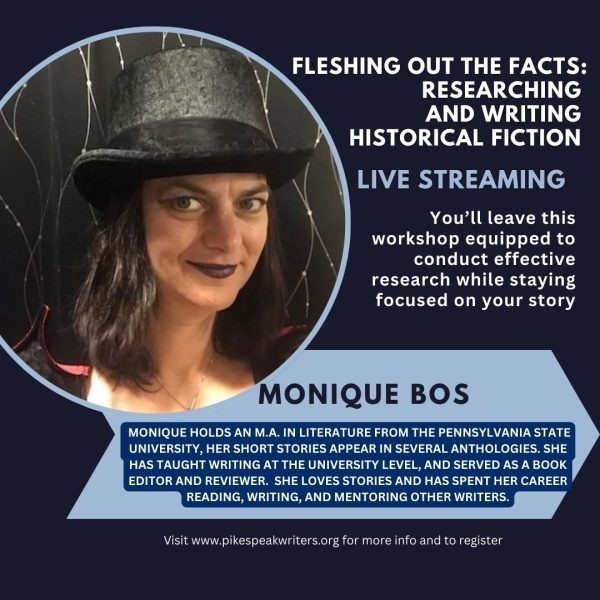 Admission: This event is FREE! But you must register. Visit https://pikespeakwriters.regfox.com/write-brain-fleshing-out-the-facts-researching-and-writing-historical-fiction-with-monique-bos for more information and to register.