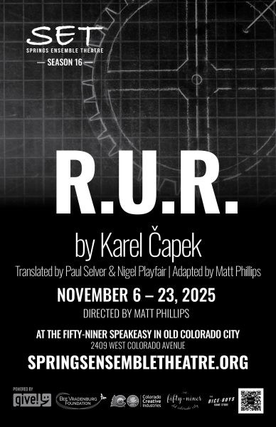 Fresh off a completely sold out run of The Shark is Broken, Springs Ensemble Theatre (SET) continues its sixteenth season with R.U.R. by Karel Čapek, adapted and directed by SET member Matt Phillips. Performances run November 6 to 23, 2025, at Springs Ensemble Theatre in the 59er Speakeasy in Old Colorado City.