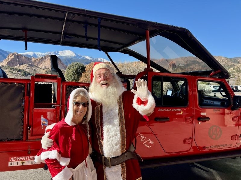 ‘Tis the season! Experience Garden of the Gods with Santa Claus himself aboard our custom-built red-nosed rein-Jeep!