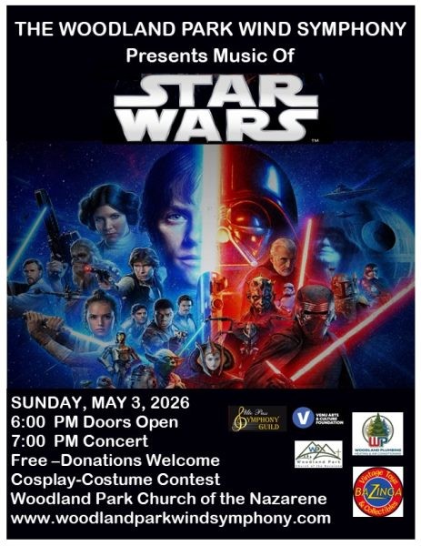 The Woodland Park Wind Symphony members will be in costume and we invite our audience to wear costumes - you don't have to sign up for the contest, just enjoy being a Star Wars character!