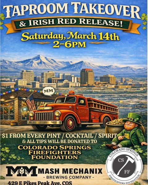 Join us Saturday, March 14th from 2–6PM as we release our Irish Red and raise a glass for a great cause. We’re donating $1 from every pint, cocktail, and spirit served — plus all tips — to the Colorado Springs Firefighters Foundation.