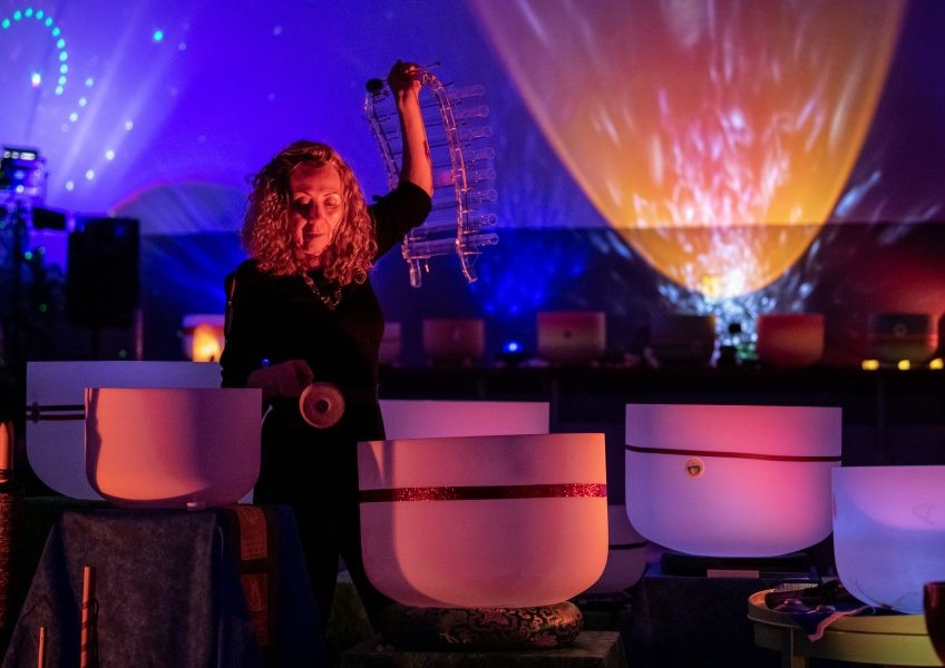 A sound bath is a meditative experience where people are "bathed" in sound waves produced by various overtone-emitting instruments, including singing bowls, gongs, chimes, and more. During a sound bath, people lie down and listen to resonant sounds, allowing their brain waves to slow and shift from a more active state to a more relaxed or dreamlike state. The goal of the experience is to invite deep rest and relaxation, explore self-inquiry and self-discovery, and help people let go of stress, anxiety, or other worries. A sound bath is typically a way of managing anxiety, soothing the nervous system, and blocking all the ideas and thoughts out of your consciousness as you connect with your body.