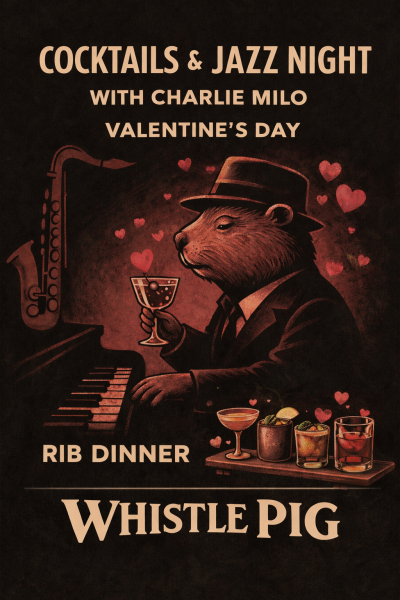 Limited dinner reservations available, from 4 to 8 pm, for Whistle Pig's famous ribs. This baby back rib dinner will be plated with a half rack of ribs, spicy bbq beans, elote, and a baked potato (butter and sour cream included).